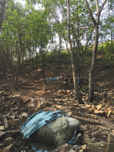 在靠近锥子山长城大毛山段的山坡上,至今可以见到随处散落的编织袋。这些编织袋有的呈白色,有的呈淡蓝色。其中,淡蓝色编织袋内,残存灰色水泥硬块。