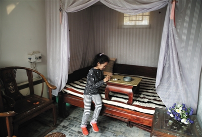 10月2日,大金丝胡同甲33号。这家民宿有三间客房,一位小女孩正在一间房间内玩围棋。新京报记者 尹亚飞 摄