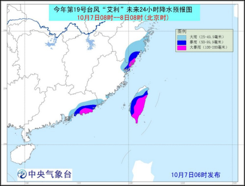 降水预报:7日08时至8日08时,浙江东南部、福建北部和东南部、广东东部、台湾大部等地的部分地区有大雨或暴雨,其中,浙江东南部、福建东北部、广东东部沿海、台湾东部局地有大暴雨(100~200毫米)。
