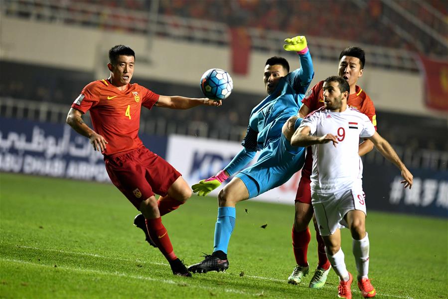 10月6日,中国队守门员顾超(左二)在比赛中扑救失败。当日,在陕西省体育场进行的2018年俄罗斯世界杯预选赛亚洲区12强赛比赛中,中国队主场0-1不敌叙利亚队。 新华社记者贺长山摄
