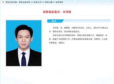 近日,新疆维吾尔自治区尉犁县政府官网上显示,该县9名县政府领导中,排位最后的副县长方祎铭,年仅26岁。