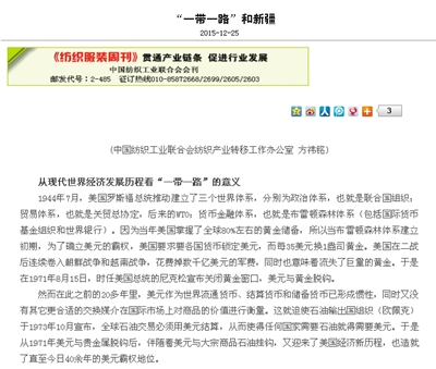 方祎铭在中国纺织工业联合会官网上发表的有关新疆政治经济发展的文章。网络截图