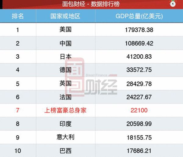 2016年胡润百富榜上榜富豪达到了2056位,总财富达到14.8万亿元人民币,折合2.21万亿美元。如果按照GDP计算,相当于1.8个俄罗斯,排名世界第七,位列法国之后,超过印度。