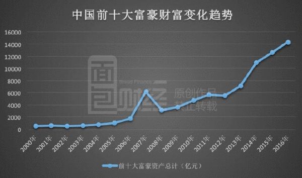 过去16年,排名前十的富豪财富增长则更为惊人。2016年胡润百富榜前十大富豪总财富达到了1.44万亿,较2000年增长了24.8倍。前十大富豪财富总额占全国GDP的比重由2000年的0.5%上涨到今年的1.65%。