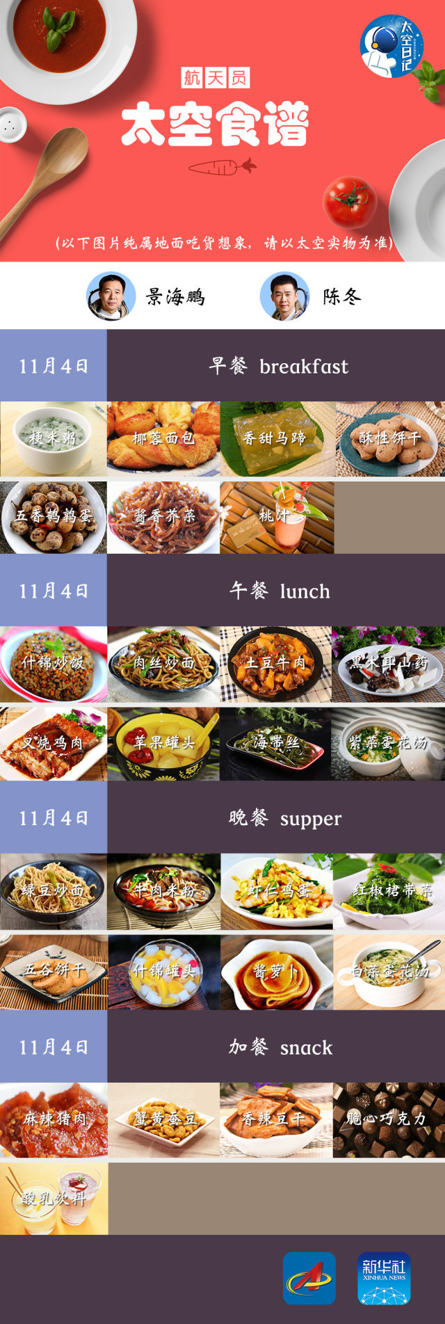 说到航天食品,大家可能会觉得特别单调,口感也不好,其实并不是这样。先说说我们今天吃的东西:早餐有粳米粥、椰蓉面包、五香鹌鹑蛋、酱香芥菜等,总共7种食品;中午有8种,包括什锦炒饭、肉丝炒面、土豆牛肉、紫菜蛋花汤等;晚上有8种,有绿豆炒面、牛肉米粉、虾仁鸡蛋、什锦罐头等;加餐有5种,包括麻辣猪肉、蟹黄蚕豆、香辣豆干等。怎么样,够丰富吧?