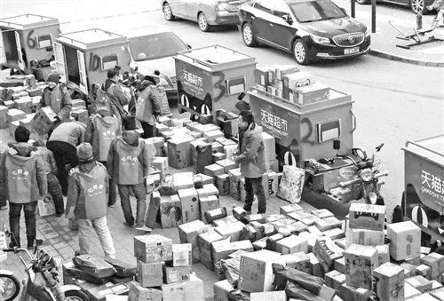 北京西城区永安路上的一家快递中转站外,快递员在分拣包裹。