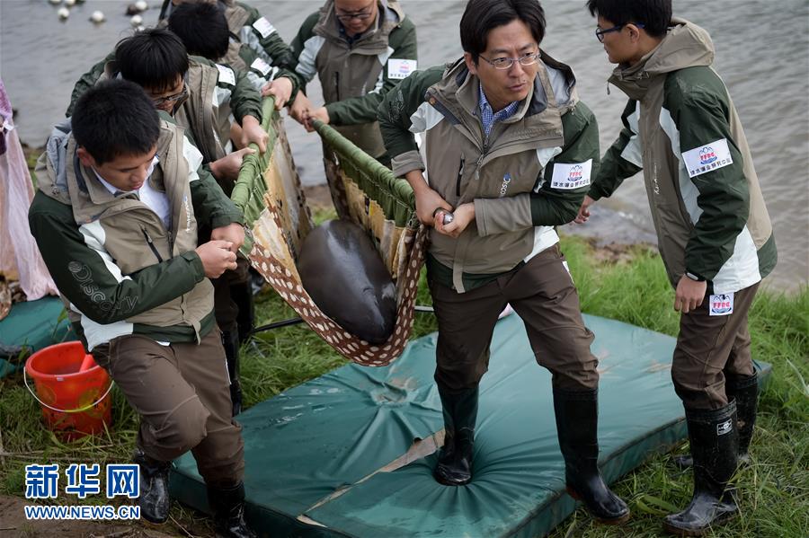 当日,安庆西江长江江豚迁地保护活动在安徽安庆市西江长江江豚迁地保护区举行,6头从长江中捕捞的江豚被放入西江中进行迁地保护。此次行动由中国科学院水生生物研究所、中国水产科学研究院淡水渔业研究中心、安庆师范大学生命科学学院3个机构提供科研支持。据介绍,密集航运、水体污染、滥捕等是长江江豚生存的威胁因素。为了更好地保护江豚,科研人员将江豚迁到与它生活环境类似的水域,进行迁地保护。新华社记者张端摄