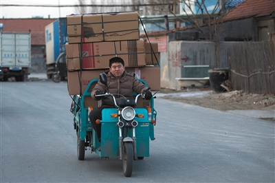 2015年2月8日,山东滨州淘宝村。30岁的快递员高鑫骑着电动三轮车在送货的路上。 周岗峰 摄