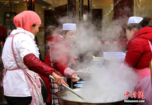 资料图:冬至,又称“冬节”。这是二十四节气中最早制订出的节气,有两千五百多年的历史。中国北方有冬至吃饺子的风俗,西安市民冬至日扶老携幼吃饺子,欢乐过“冬节”。马智峰 摄