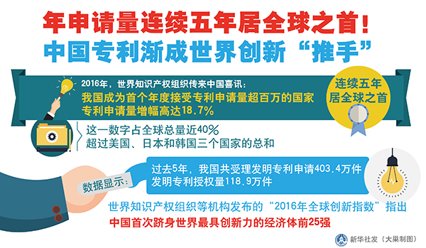 图表:年申请量连续五年居全球之首!中国专利渐成世界创新“推手” 新华社发 大巢制图