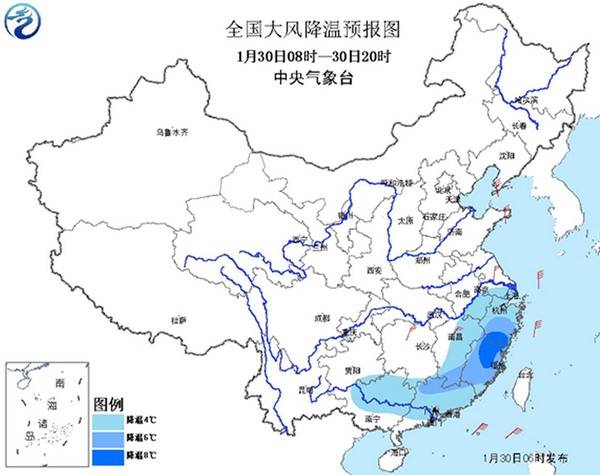 今天,这股冷空气将进一步南下深入我国,南方气温将大面积跳水,江南一带降幅达到8℃以上。中央气象台预计,30日08时至20时,江南东部、华南大部等地的日平均气温或最低气温将下降4~6℃,其中,浙江南部、福建北部等地的局地降温幅度可达8℃以上,上述地区将伴有4~6级风,东部和南部海区有7~8级风,阵风9~10级。