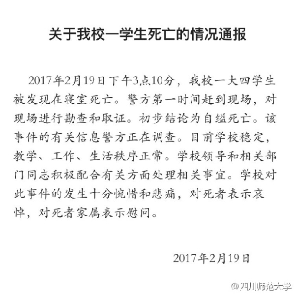 2月19日晚,四川师范大学官方微博发布《关于我校一学生死亡的情况通报》,通报称,2月19日下午3点10分,该校一大四学生被发现在寝室死亡。警方第一时间赶到现场,对现场进行勘察和取证,初步结论为自缢死亡。该案件的有关信息警方正在调查。目前,学校稳定,教学、工作、生活秩序正常。