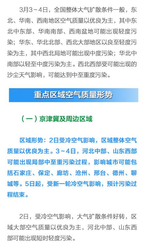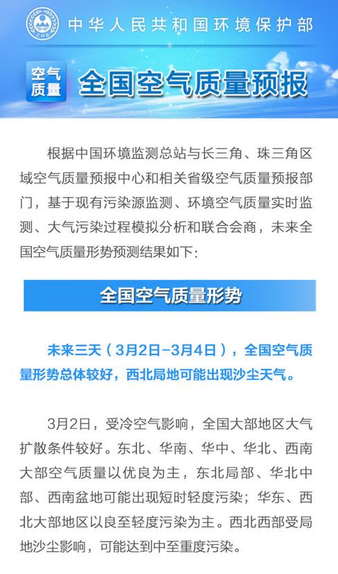 据环境保护部宣传教育司官方微博消息,未来三天(3月2日-3月4日),全国空气质量形势总体较好,西北局地可能出现沙尘天气。