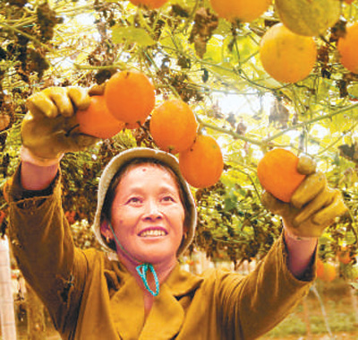 江西省靖安县水口乡桃源村农民李海兰在采收吊瓜。