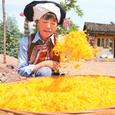 云南巍山五印乡新民村高山彝族群众在晾晒中药材红花。