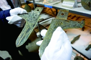 另有少量青铜容器风格与楚文化青铜器风格接近。其中一件青铜盏,盖、身大部分饰蟠螭纹,捉手、器耳、器足采用透雕、浮雕工艺,精美异常;有两件青铜戈,戈身上分别绘有精致的龙纹、虎纹浮雕,活脱脱一个“虎踞龙盘”;还有约4厘米长、颇为精致的各式铜削刀等微小器具。