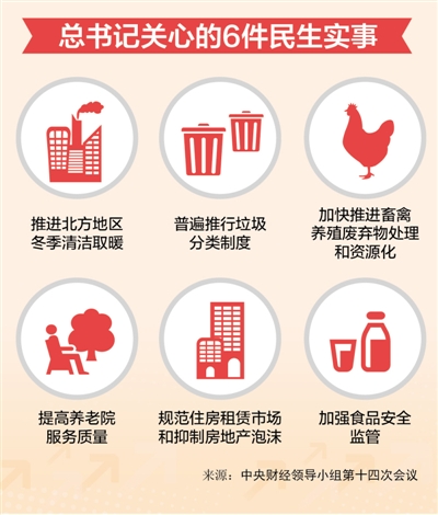 习近平总书记主持召开中央财经领导小组第十四次会议时强调,落实以人民为中心的发展思想,想群众之所想、急群众之所急、解群众之所困,在学有所教、劳有所得、病有所医、老有所养、住有所居上持续取得新进展。习近平强调,推进北方地区冬季清洁取暖等6个问题,都是大事,关系广大人民群众生活,是重大的民生工程、民心工程。代表委员们表示,要持续推进民生工程建设,加快全面建成小康社会步伐,让人民群众拥有更多获得感。