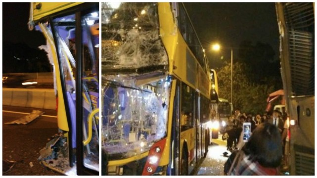 消防处助理救护总长陈庆愉说,一辆大巴上坐在上层最前排的一名女乘客头部受伤,情况严重。