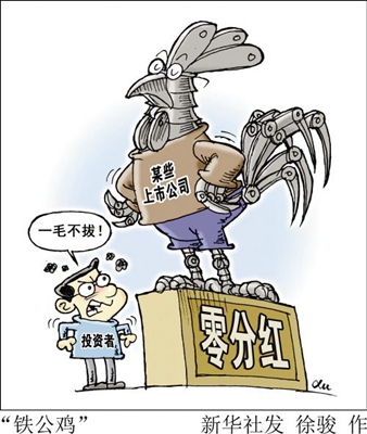 但是,破坏市场伦理甚至法治规则的“铁公鸡”们,毕竟是破坏市场肌体健康的股市之痛,一个法治化的市场绝不能任其“铁心到底”。刘主席这一次的表态,无疑是当头棒喝。接下来,还得期盼监管部门使出霹雳手段,一方面在制度建设上进一步完善,增加对上市公司分红的强制性、约束性,牢牢肩负起保护投资者,特别是中小投资者合法权益的神圣重担;另一方面,对于那些涉嫌财务造假的上市公司,还要出重拳治理,该处罚的处罚,该退市的退市,该退场的退场,大力培树法治、诚信的市场伦理和偏重理性、价值的投资文化。“雷霆与雨露,一例是春风”,我们一方面要大力支持、依法保护上市公司的发展,同时也要严明规矩,保护各类投资者的权益,让“坏孩子”付出沉重代价,让市场始终充盈公平正义诚信法治的最强音。