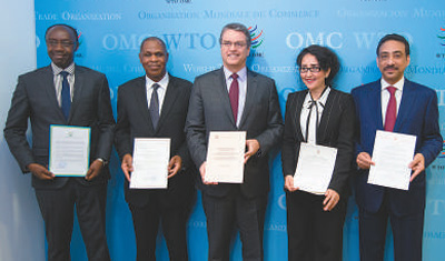 2017年2月,世贸组织《贸易便利化协定》正式生效。图为世贸组织总干事和一些国家代表展示《贸易便利化协定》议定书。新华社发