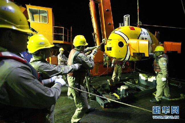 4月28日,“潜龙三号”完成南海航段最后一潜,科考队员将其回收至母船。新华社记者 刘诗平 摄