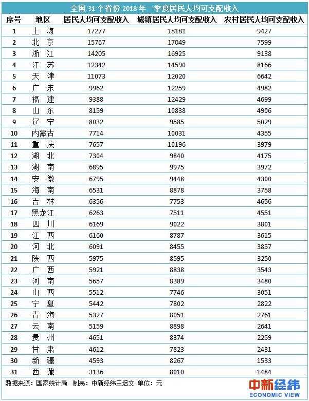 中新经纬客户端5月3日电(王培文)国家统计局日前公布31个省份2018年一季度居民人均可支配收入,数据显示,5省份一季度人均可支配收入过万,上海以17277元位居全国首位。
