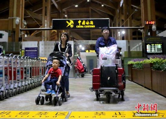 海南今年5月1日起实施59国人员入境旅游免签政策,图为当日首批免签游客抵三亚。王晓斌 摄
