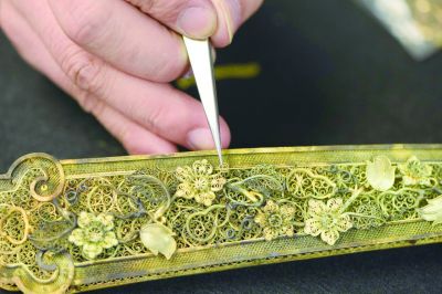 “其实,短短几天要完全掌握花丝镶嵌工艺根本就不可能。学徒需要经历3至5年时间才能学会。而每期培训班仅能介绍一个很简单的工艺,如点翠工艺,就是将翠鸟的羽毛巧妙地粘贴在金银制成的金属底托上,形成精美的图案。这些图案上一般还会镶嵌珍珠、翡翠、红珊瑚、玛瑙等宝玉石,越发显得典雅而高贵。但只有亲手制作这个小作品,才能真正感受到传统文化的魅力。”张汝婕说,“我们通过这样一点点地渗透,将花丝镶嵌文化慢慢传承下去。”