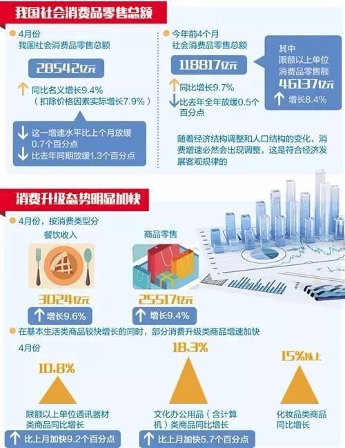 4月份,按消费类型分,餐饮收入3024亿元,增长9.6%;商品零售25517亿元,增长9.4%。