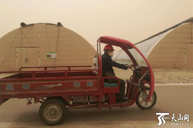张锐戴着口罩,冒着风沙,骑着三轮摩托查看大棚情况。