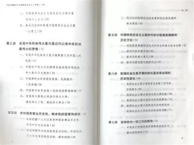 这三十个专题,每专题最少3节,最多8节。如,第四讲“党和国家事业历史性、根本性的变革和成就”,只有3节:全面把握十八大以来党和国家事业历史性变革和历史性成就;深刻理解历史性成就是全方位的、开创性的,历史性变革是深层次的、根本性的;充分认识取得历史性变革和历史性成就的根本原因。第二十九讲“努力掌握马克思主义思想方法和工作方法”,一共8节,分别为:坚持实事求是、坚持战略定力、坚持问题导向、坚持全面协调、坚持底线思维、坚持调查研究、坚持抓铁有痕、坚持历史担当 。