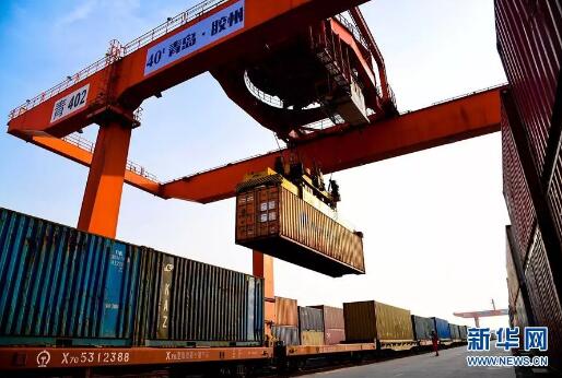 在青岛胶州湾国际物流园,龙门塔吊在往中亚班列上装载货物 新华社记者 郭绪雷摄