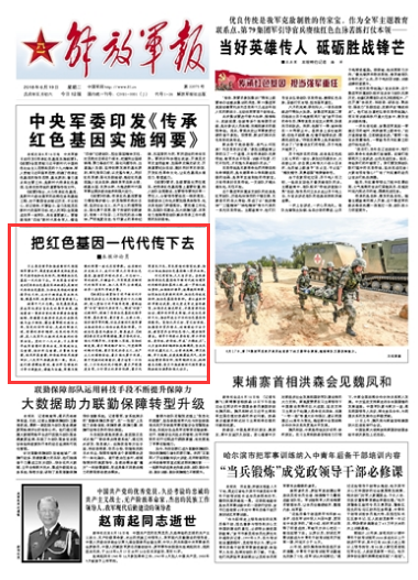 树高千尺不忘根。红色基因是我党我军性质宗旨本色的集中体现,凝结着老一辈革命家的艰辛探索和智慧韬略,承继着无数革命先烈的赤胆忠诚与奋斗牺牲,蕴含着鲜明的政治立场、坚定的信仰信念、先进的制胜之道、崇高的革命精神、优良的作风纪律,是人民军队从胜利走向胜利的传家法宝。党的十八大以来,习主席领导我军重整行装再出发,实现政治生态重塑、组织形态重塑、力量体系重塑、作风形象重塑,好传统好作风强势回归,人民军队面貌焕然一新。然而,我们要清醒地看到,意识形态领域的斗争日趋激烈,铸魂与蛀魂、固根与毁根的较量一刻也没有停歇。站在新的历史起点上,我们必须大力传承红色基因,激励官兵铭记历史、不忘初心、牢记使命、不懈奋斗,为实现党在新时代的强军目标、把人民军队全面建成世界一流军队贡献力量。