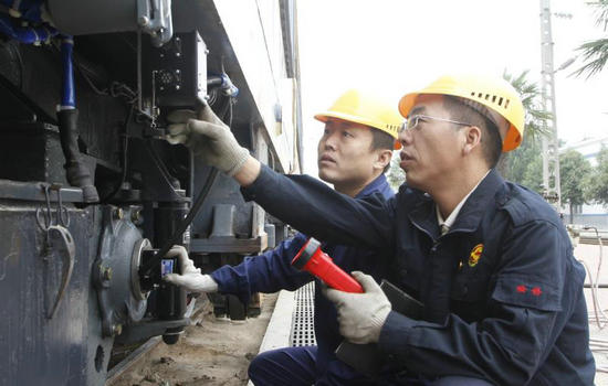 连继革(右)和同事进行车辆检修