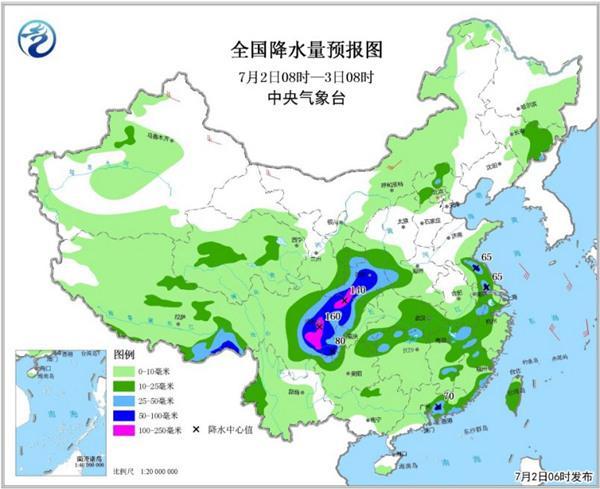 预计今(2日)明天,强降雨将集中在四川盆地、西北地区东部等地,四川、陕西、河南等省区有暴雨,局地大暴雨。前期川陕甘交接降雨已明显偏多,需要特别警惕中小河流洪水和地质灾害的发生。气温方面,本周初华北高温短暂缓解;南方高温也是先抑后扬,江南一带将迎来持续晴热天气。