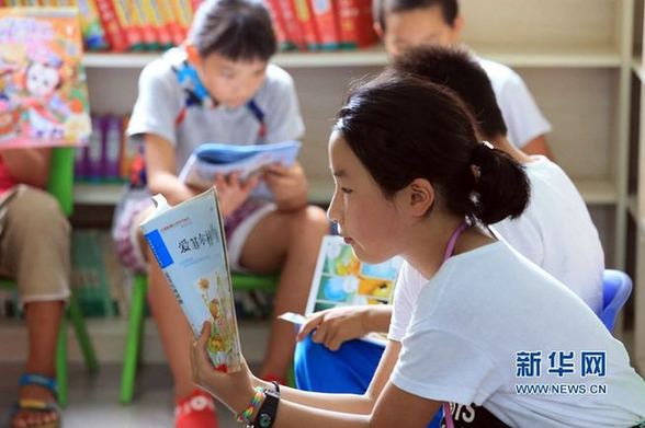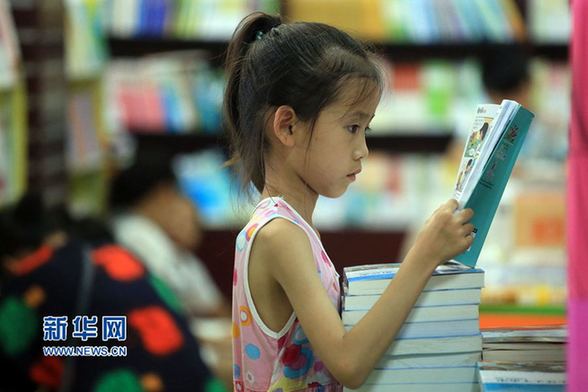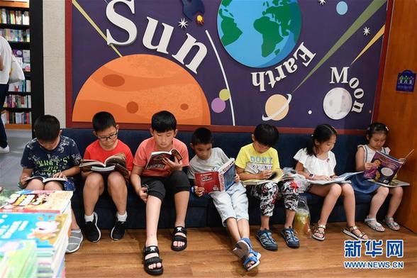 7月28日,小朋友在杭州市一家书店阅读。暑假期间,浙江省杭州市许多小朋友来到书店阅读、购书,在静谧的环境里享受阅读的乐趣。