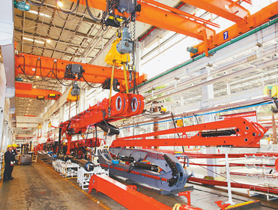 图为三一重工智能制造车间,工人正在远程操控臂架翻转智能吊具。