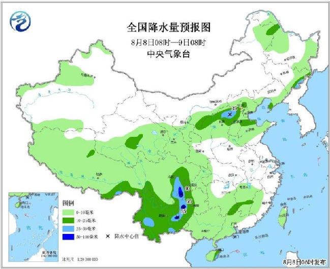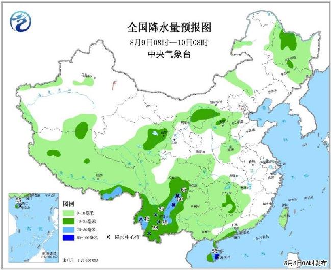 图2 全国降水量预报图(8月8日08时-9日08时)