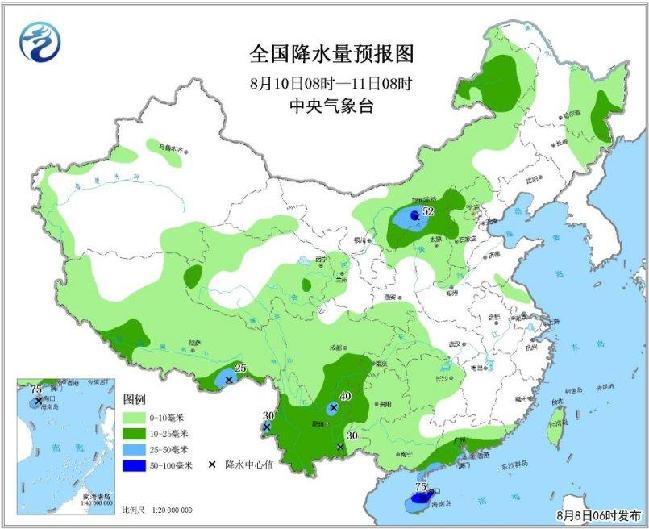 8月10日08时至11日时08,内蒙古西南部和东北部、黑龙江东南部、四川盆地南部、重庆西南部、贵州西部、云南大部、广东南部、海南岛、西藏南部等地的部分地区有中到大雨,局地暴雨(50~75毫米)(见图4)。