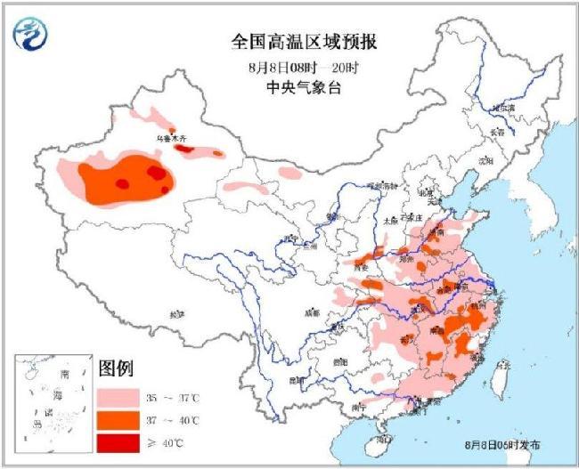 未来三天,黄淮、江淮、江汉、江南、华南等地的高温范围将逐渐扩大。预计8月8日白天,陕西关中地区、黄淮大部、江淮、江汉大部、四川盆地东北部、江南大部、华南中东部及新疆南疆盆地和沿天山一带等地的最高气温有35~36℃,其中,陕西关中地区、黄淮中北部、江淮中部、江汉西部、江南中东部及南疆盆地等地的部分地区最高气温有37~39℃,新疆局地可达40℃以上(见图1)。中央气象台于8月8日06时继续发布高温黄色预警。
