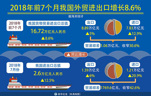 新华社北京8月8日电(记者郁琼源)据海关统计,今年前7个月,我国货物贸易进出口总值16.72万亿元人民币,比去年同期增长8.6%。