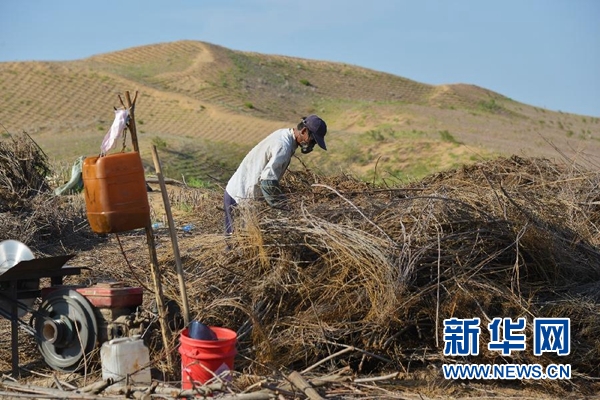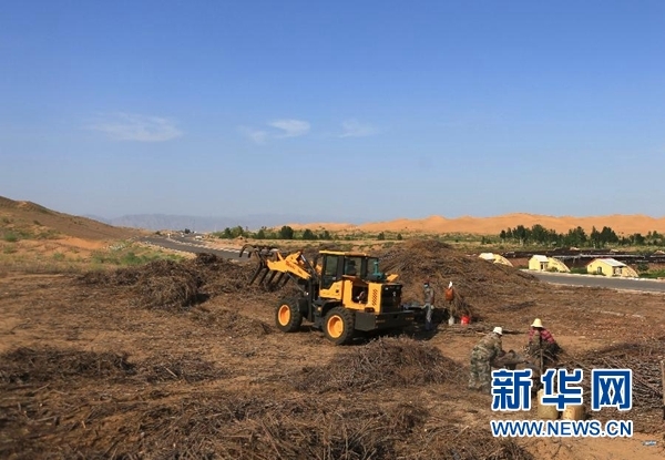 在内蒙古鄂尔多斯市杭锦旗,工人为新修的穿沙公路制作沙障(7月26日摄)。新华社记者 邹予 摄