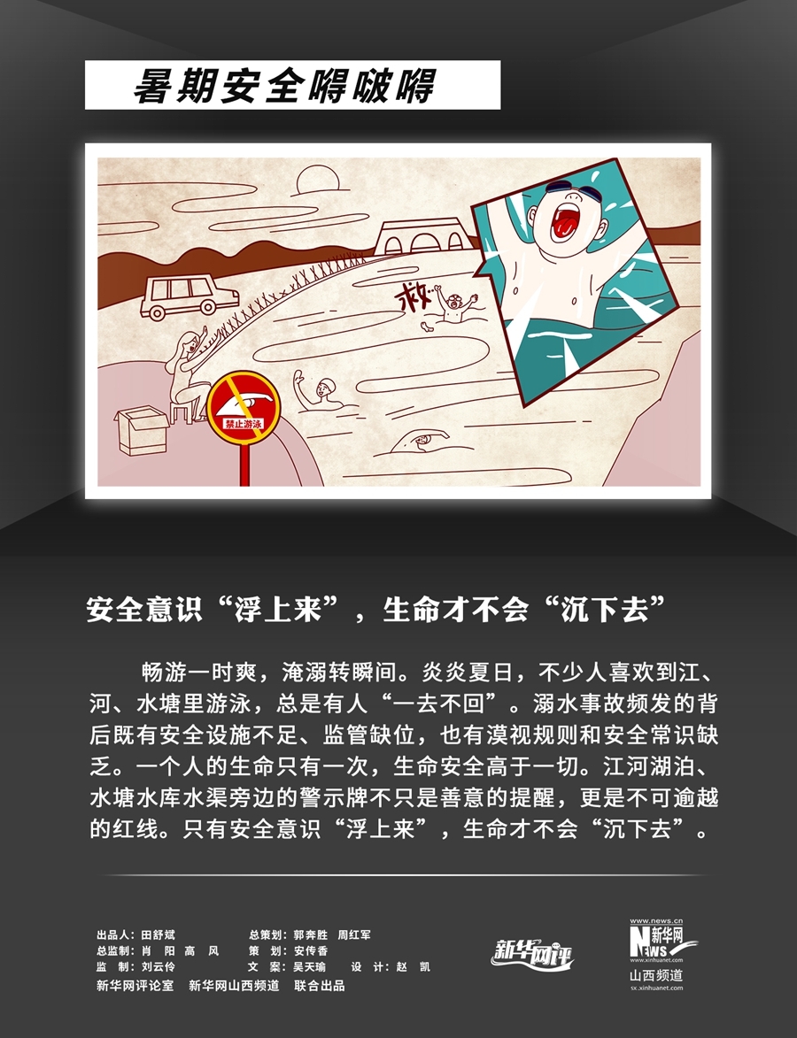畅游一时爽,淹溺转瞬间。炎炎夏日,不少人喜欢到江、河、水塘里游泳,总是有人“一去不回”。溺水事故频发的背后既有安全设施不足、监管缺位,也有漠视规则和安全常识缺乏。一个人的生命只有一次,生命安全高于一切。江河湖泊、水塘水库水渠旁边的警示牌不只是善意的提醒,更是不可逾越的红线。只有安全意识“浮上来”,生命才不会“沉下去”。(吴天瑜)