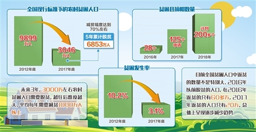 在以习近平同志为核心的党中央坚强领导下,脱贫攻坚力度之大、规模之广、影响之深前所未有。经过几年的努力,脱贫攻坚取得决定性进展:全国现行标准下的农村贫困人口由2012年底的9899万人,减少到2017年底的3046万人,5年累计脱贫6853万人,减贫幅度达到70%左右。贫困发生率由2012年底的10.2%下降到2017年底的3.1%。贫困县数量实现了首次减少,2016年有28个贫困县脱贫摘帽,2017年有125个贫困县申请摘帽,今年计划200多个县摘帽,解决区域性整体贫困迈出坚实步伐。贫困地区群众生产生活条件明显改善,贫困群众收入水平明显提高、获得感明显增强。