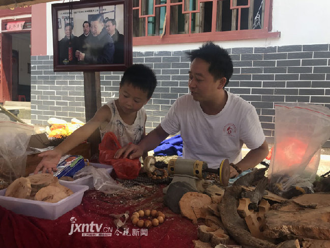 左春仁在浙江义乌打工六七年,一直从事木制手工纪念品的制作,学得了一手好手艺。看到村里变化这么大,人气越来越旺,他去年回来干起了老本行,在家里手工制作旅游纪念品,就地取材、现做现卖,生意非常红火,平均下来月收入有四五千元。
