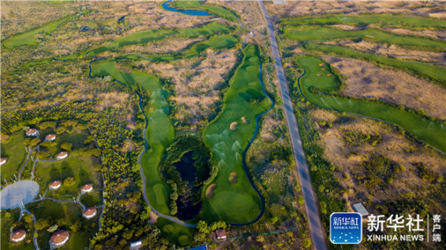 这是位于库布其沙漠中的七星湖景区(2018年7月11日无人机拍摄)。在中国,几代人的奋斗成功实现库布其、塞罕坝等“人进沙退”,这样的成功范例让“一带一路”的伙伴们倍加重视中国的防沙治沙技术和经验。新华社记者 彭源 摄
