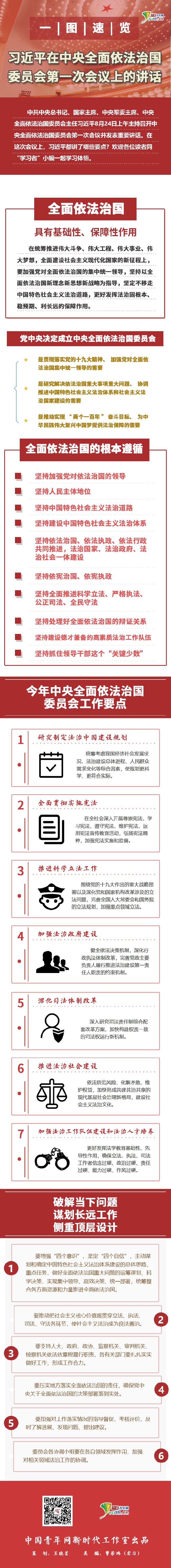 中国青年网北京8月26日电(记者 王晓芸 实习记者 曹若鸿)中共中央总书记、国家主席、中央军委主席、中央全面依法治国委员会主任习近平8月24日上午主持召开中央全面依法治国委员会第一次会议并发表重要讲话。在这次会议上,习近平都讲了哪些要点?欢迎各位读者同“学习者”小编一起学习体悟。