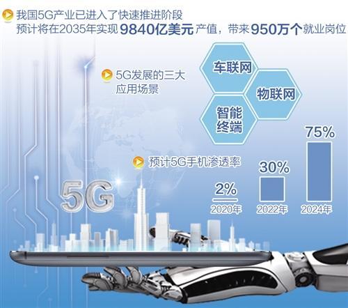 王彬表示,我国5G产业已进入了快速推进阶段,形成了“三大运营商基本完成布局、主设备具备较大领先优势、终端厂商技术基本持平”的发展态势。预计将在2035年实现9840亿美元产值,带来950万个工作岗位。