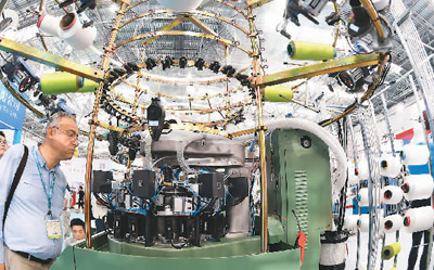 5月17日,在第十九届中国义乌国际纺织服装工业博览会上,一名外商在了解一款细针距内衣机。龚献明摄(人民视觉)