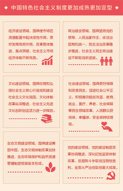 守正创新的生动体现。改革开放以来,我们坚持守正创新的基本逻辑、价值取向,既表现出志不改、道不变的坚定,也表现出大胆地试、勇敢地改的决断;既注意到社会变革的深刻性、广泛性、复杂性,又保持了社会发展的方向性、稳定性、延续性。对于中国制度而言,就是坚持和完善根本政治制度、基本政治制度、基本经济制度,完善中国特色社会主义法律体系,不断创新经济体制、政治体制、文化体制、社会体制、生态文明体制等各项具体制度。比如,从经济领域来看,我们既始终坚持公有制经济为主体,又不断探索基本经济制度有效实现形式,筑牢了巩固和发展中国制度的基础;我们既始终坚持发挥社会主义制度的优越性,又注重突破旧的经济体制束缚,建立起社会主义市场经济体制,实现了社会主义基本制度与市场经济体制相结合的伟大创举。党的十八届三中全会以来,以习近平同志为核心的党中央围绕全面深化改革总目标,着力抓好重大制度创新,全面深化经济、政治、文化、社会、生态文明体制和党的建设制度改革。目前,党的十八届三中全会提出的336项重大改革举措中已出台实施方案的超过95%,中国制度守正创新结出累累硕果。